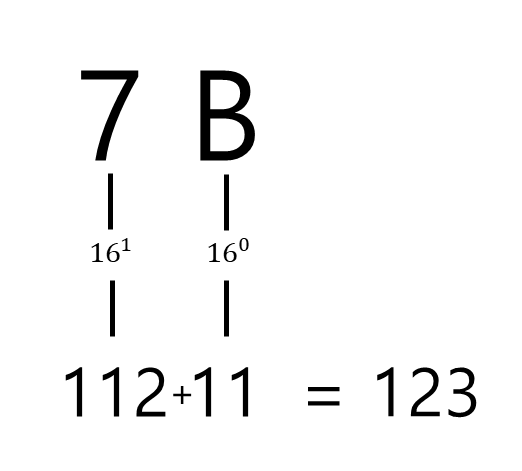 16진수 '7B'를 10진수로 표현을 하면 16의 n승한 값에 그 자릿수를 곱하여 나온 값을 전부 더하면 10진수로 변환됩니다.