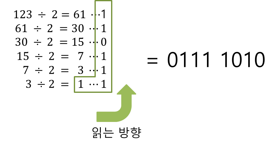 반대로 10진수를 2진수로 변환을 하는 방법은