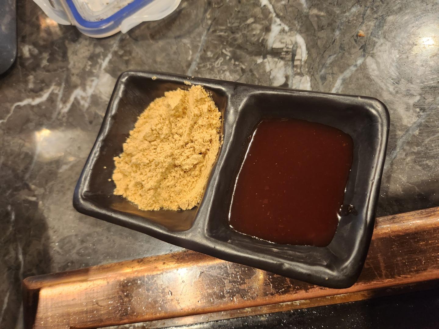 잘 구워진 껍데기를 요 콩고물과 소스에 살짝 찍어먹으면 쫀득한 식감과 맛이 최고랍니다.ㅎㅎ