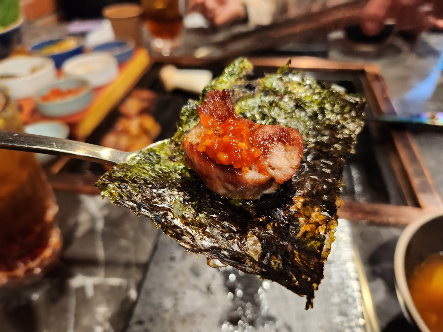 다음엔 김 위에 잘 익은 고기 한 점을 오징어밥식해와 싸서 먹어보고!!