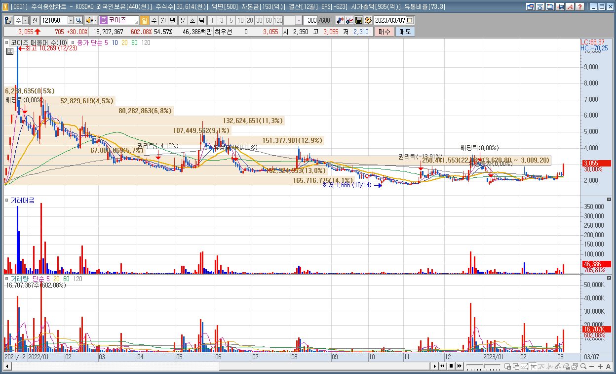 | 1 | 코이즈 | 30.00% | LCD BLU제조 | 제3 산업단지에 2차전지 양극재 첨가제 양산 공장을 신설한다는 소식 |