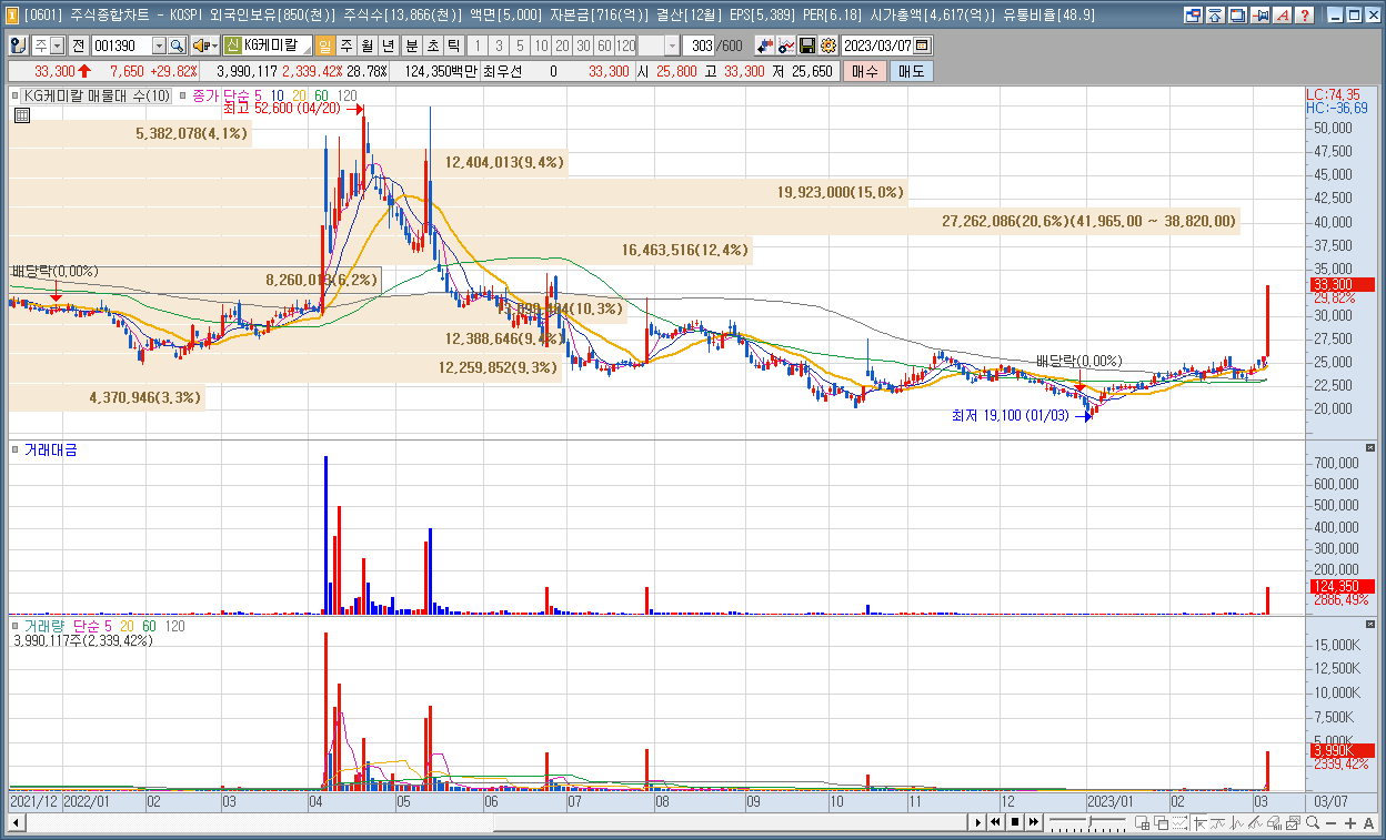 | 5 | KG케미칼 | 29.82% | 비료 | 중국의 올해 곡물생산량 증산, 계열사 KG에너켐 2차전지주 랠리 |