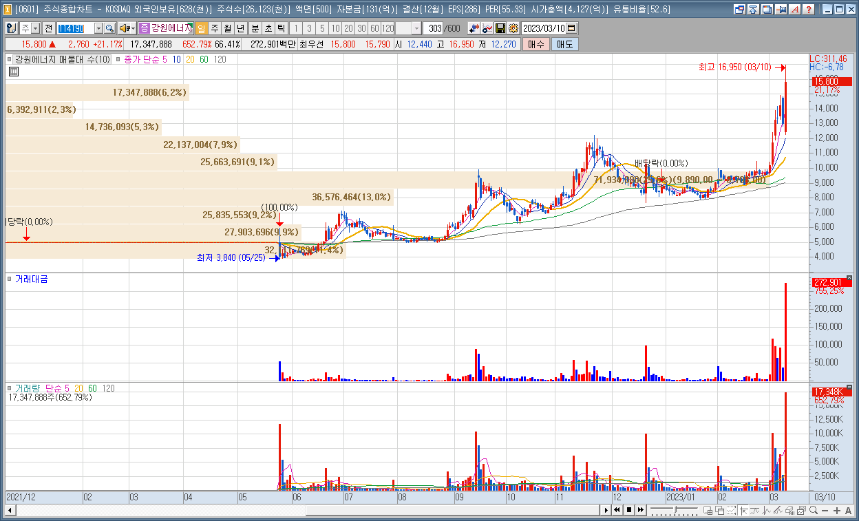 | 4 | 강원에너지 | 21.17% | 리튬 | 국내 최초 자체 개발 생산공저을 통해 무수수산화리튬 생산 샘플테스트 통과 |