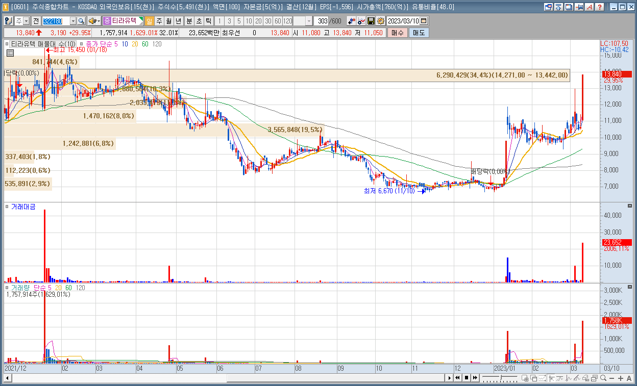 | 1 | 티라유텍 | 29.95% | 스마트팩토리 | ‘인터배터리 2023’ 전시회, 2차전지 특화 패키지 서비스를 선보인다는 소식 |