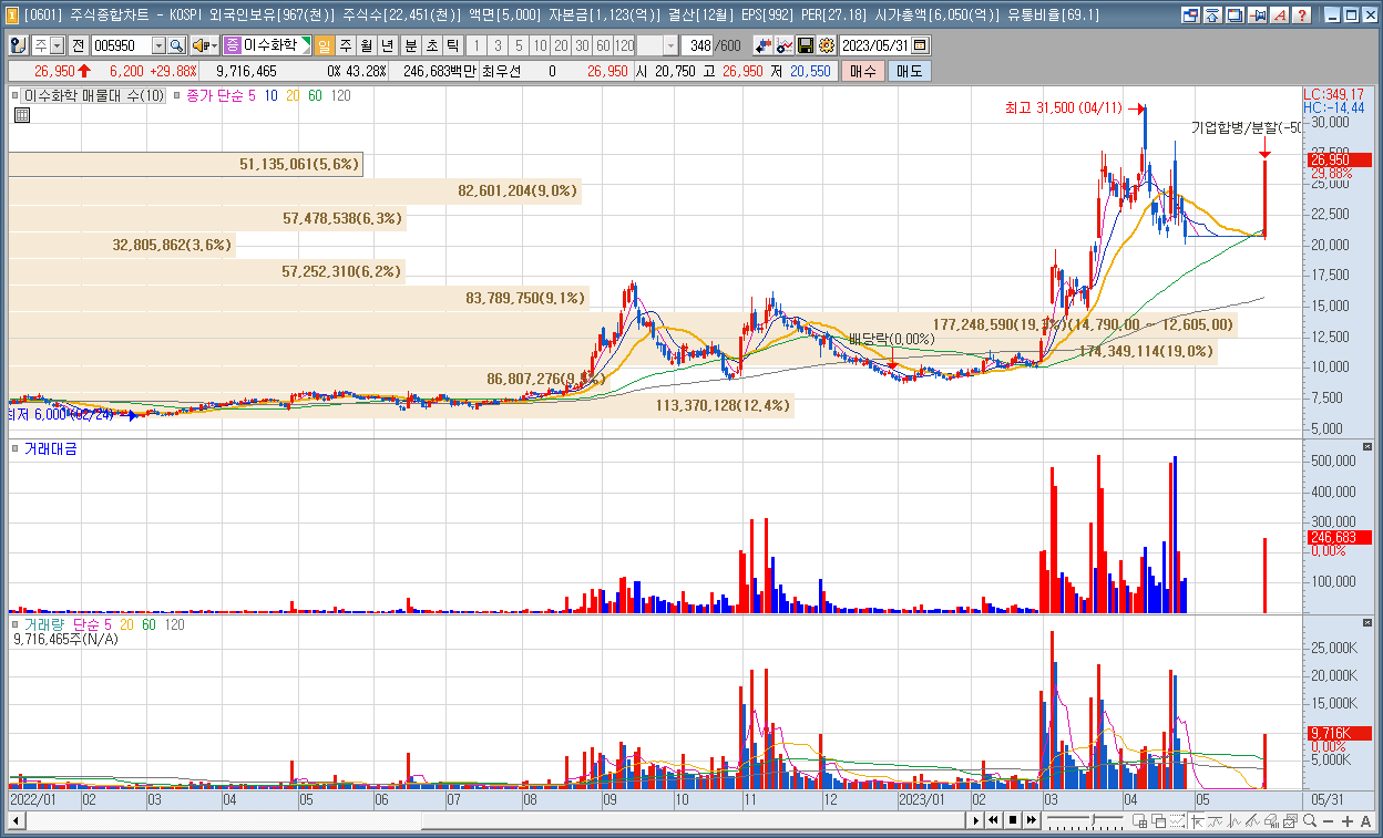 | 1 | 이수화학 | 29.88% | 2차전지 | 인적분할 후 첫날 상한가 |