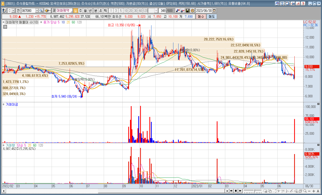 | 6 | 대화제약 | 15.77% | 치매 | 경구형 파클리탁셀 제제로 항암치료제 시장 공략 소식 |