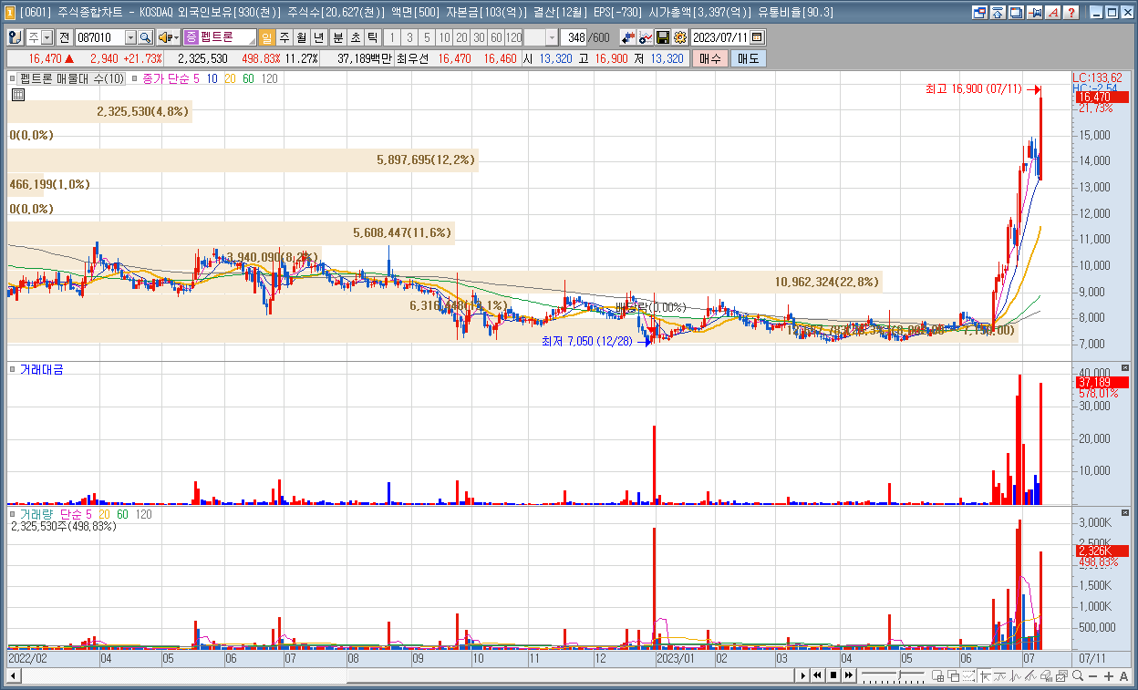 | 7 | 펩트론 | 21.73% | 치매 | '2023 미국당뇨학회' 참가 후 1개월 이상 지속 비만·당뇨 치료제에 대한 라이선싱 계약 텀시트 수령 소식 지속되며 상승 |