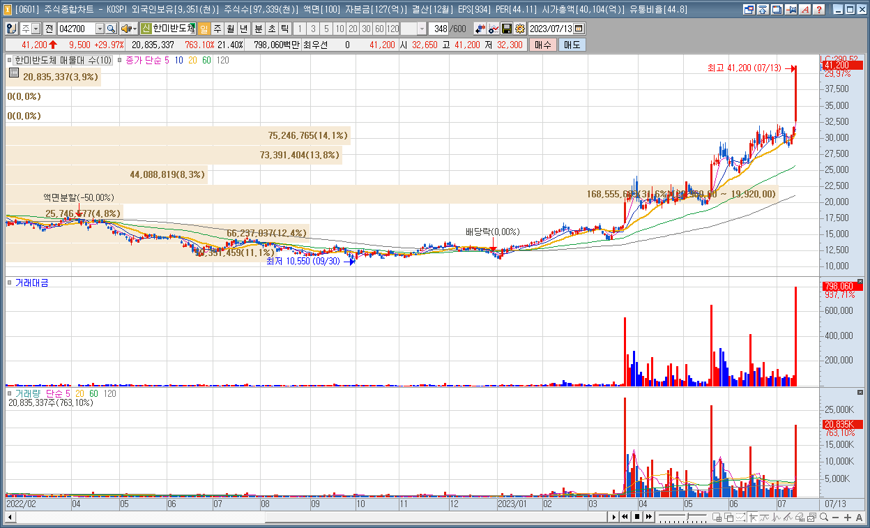 | 2 | 한미반도체 | 29.97% | 시스템반도체 | 생성형 인공지능에 필요한 고대역폭 메모리 반도체 수혜주 부각 |