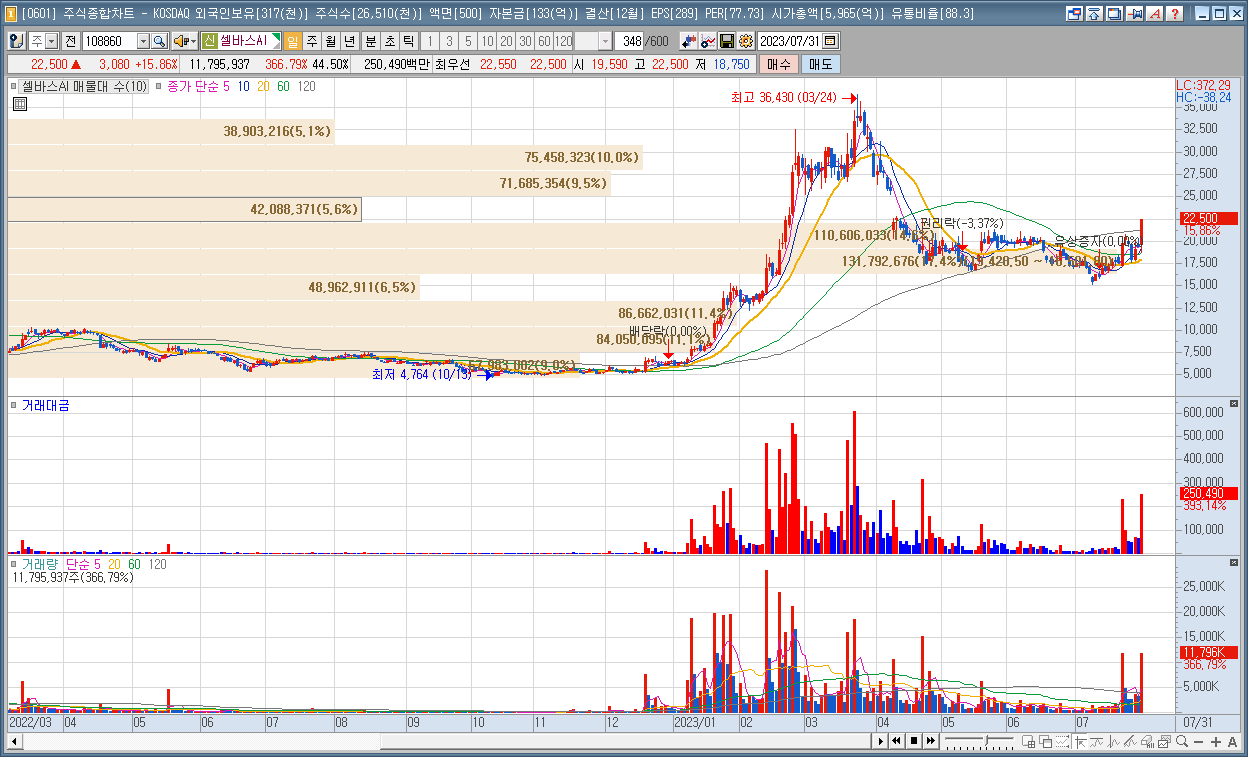 | 8 | 셀바스AI | 15.86% | 인공지능 | 네이버 초거대 인공지능 '하이퍼클로바X' 출시 소식 |