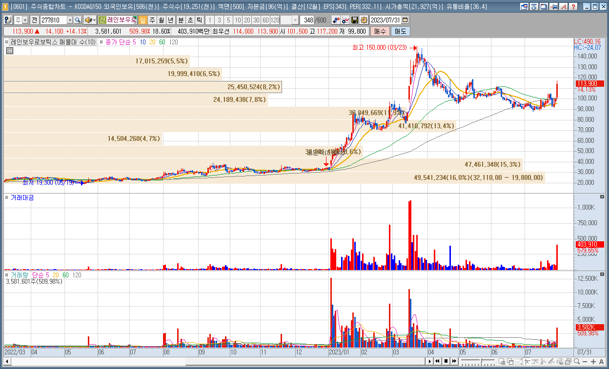 | 10 | 레인보우로보틱스 | 14.13% | 로봇 | 삼성전자 갤럭시 언팩행사에서 레인보우로보틱스와 삼성전자의 협업 로봇 실물 최초공개 |