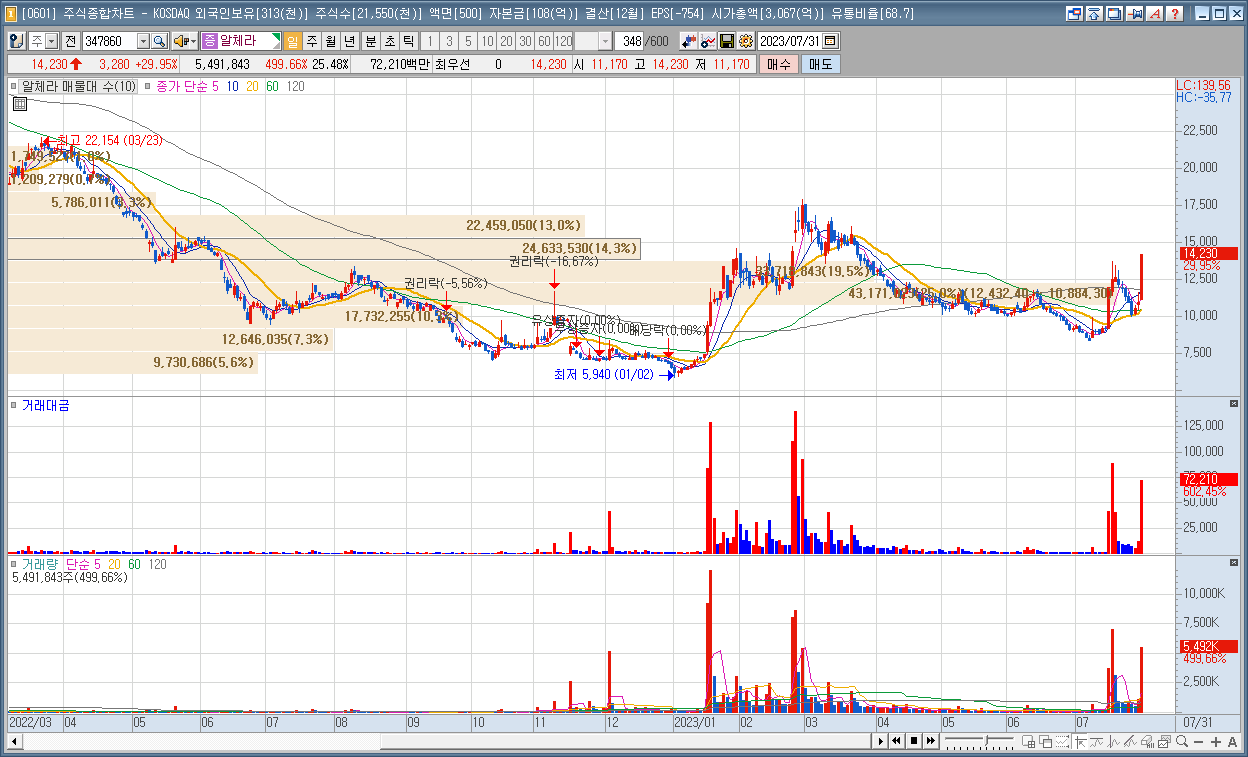 | 3 | 알체라 | 29.95% | 인공지능 | 네이버 초거대 인공지능 '하이퍼클로바X' 출시 소식 |