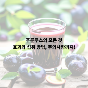 안녕하세요! 오늘은 푸룬주스에 대해 알아보려고 해요. 푸룬주스는 자두를 원료로 한 건강 음료로, 많은 사람들이 즐겨 마시는 음료 중 하나인데요. 그럼 푸룬주스란 무엇인지부터 시작해서, 다양한 효과와 섭취 방법, 그리고 주의사항까지 알아보도록 할게요.