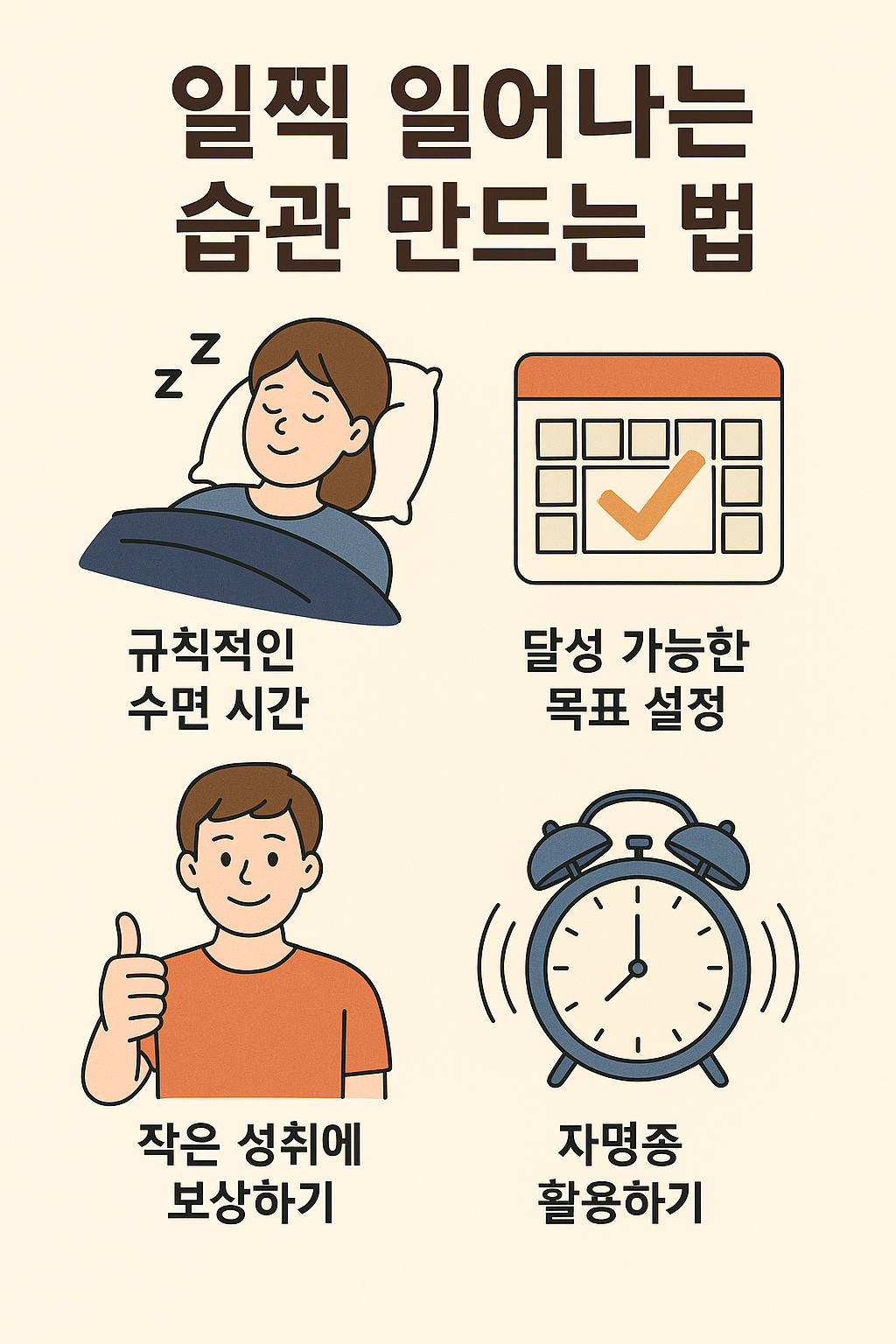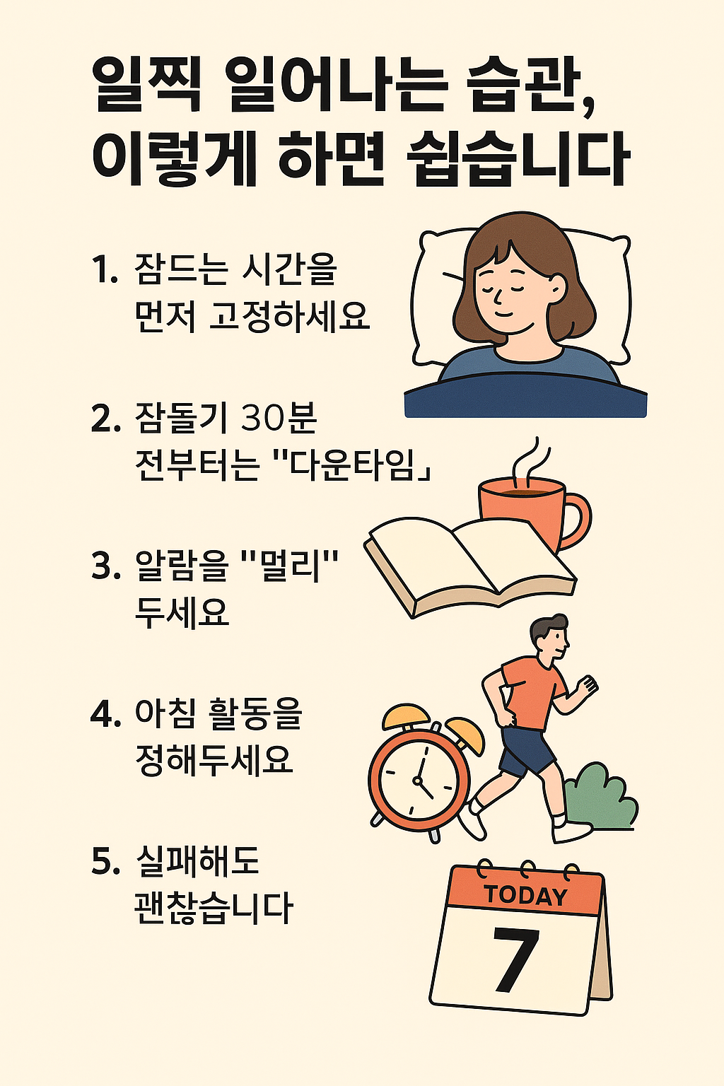 일찍 일어나는 습관은 우리의 삶에 긍정적인 변화를 가져다줍니다. 처음에는 힘들 수 있지만, 꾸준히 노력하면 자연스럽게 몸에 배게 됩니다. 오늘부터 작은 변화로 시작해 보세요. 여러분의 하루가 더 밝고 생산적으로 바뀔 것입니다! 🌞