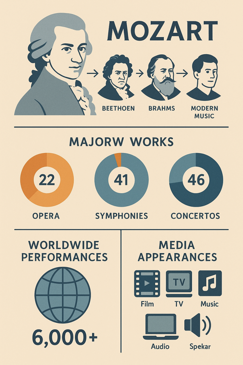 모차르트의 음악은 베토벤, 슈베르트, 브람스 등 수많은 작곡가에게 영향을 주었습니다. 그의 작품은 오늘날에도 전 세계 오케스트라, 오페라 극장, 영화, 교육 현장 등에서 널리 사용됩니다.