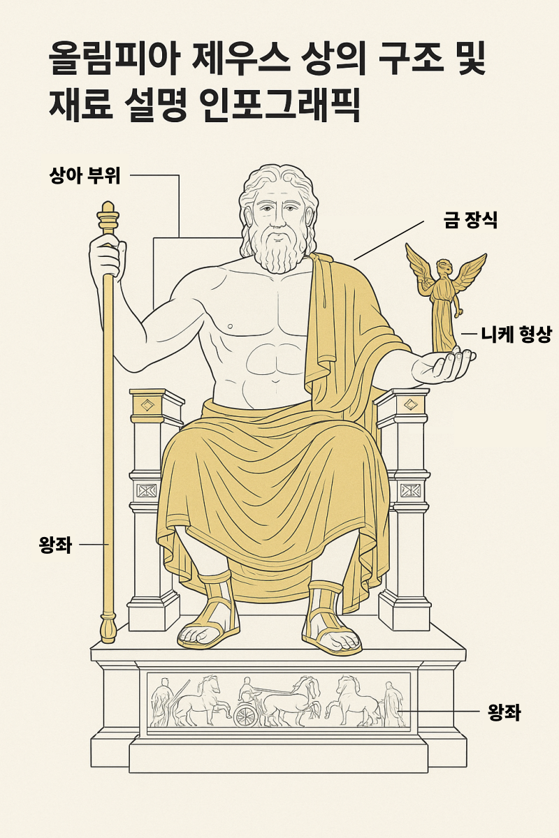 상아는 피부 부분에, 금은 의복과 보석에 활용되었습니다. 이는 제우스의 신성함과 절대 권력을 상징하며, 고대 조각 중 가장 화려한 작품으로 꼽힙니다.
