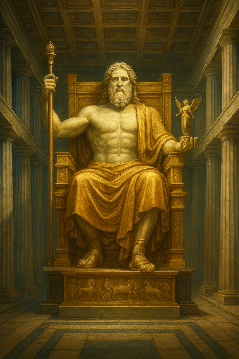 제우스는 고대 그리스 신화에서 최고의 신이며, 올림피아는 그의 숭배 중심지였습니다. 매년 열리던 고대 올림픽 경기는 그를 기리기 위한 종교 의식의 일환이었고, 제우스 상은 그 중심에 위치했습니다.