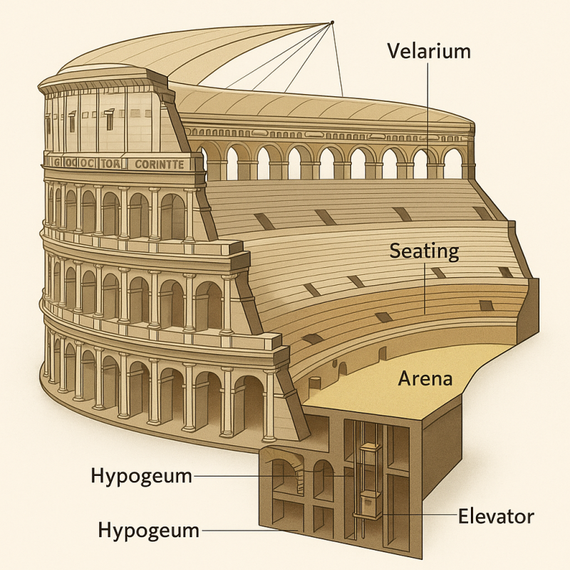 초기 개장 당시에는 완전히 갖추어지지 않았고 후대에 확충. 복도, 동물 우리, 리프트, 함정문(trapdoor) 등으로 구성되어 검투사·맹수·무대 장치가 “순간 등장”하는 극적 연출 가능.
